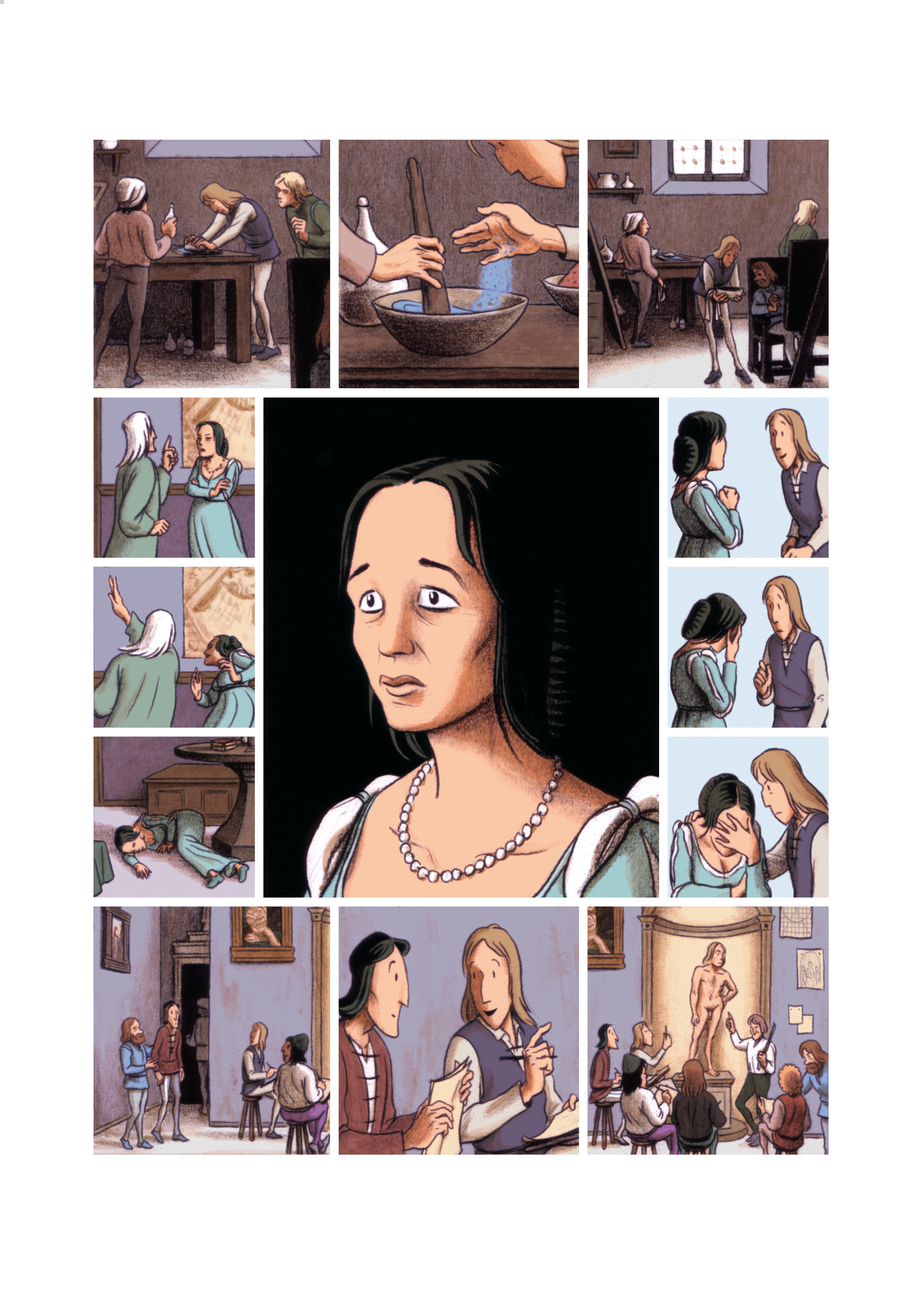 Sur cette scène, j’ai voulu donner le sentiment que l’atelier de Bellini est très grand. Suivant la déambulation de Tiziano, j’ai donc « déplié » le décor horizontalement en sept cases, avec une reprise à chaque fois de l’image précédente, ce qui étire artificiellement la longueur de la pièce et permet de dupliquer les personnages pour donner une impression grouillante.