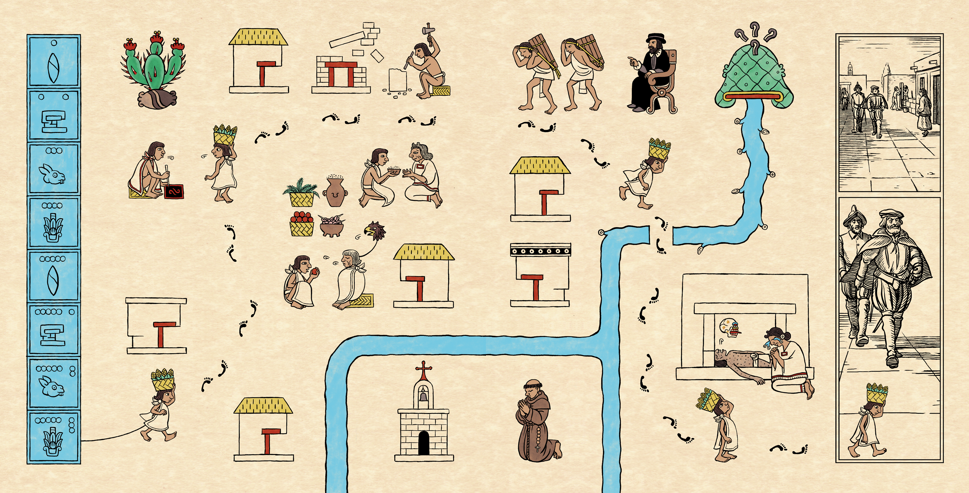 Le tianquiztli, ou marché, a été dessiné d’après un plan datant des années 1580, où l’on peut voir comment il était organisé, non loin du tecpan. J’ai tenté de respecter sa configuration, y compris en tenant compte des marchandises vendues à tel ou tel endroit, ce que j’ai figuré en m’inspirant de nombreuses images issues du livre IX du Codex de Florence consacré aux marchands, ou du livre X consacré aux gens du peuple. L’historienne Barbara Mundy développe ses recherches à propos du quartier de San Juan Moyotlan au XVIe siècle en l’agrémentant de nombreuses illustrations dans la conférence suivante (en espagnol) : https://www.youtube.com/watch?v=zbUGnvItLNE.