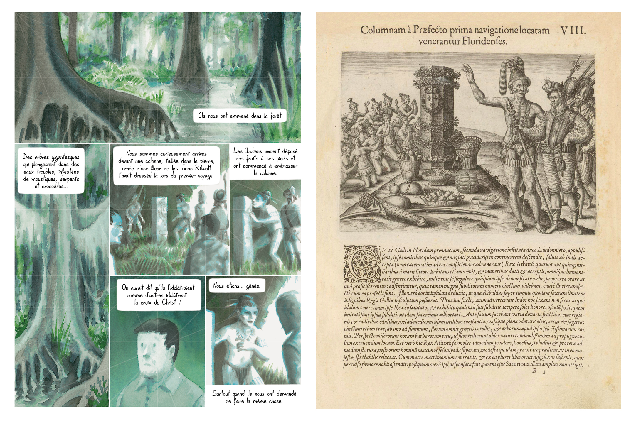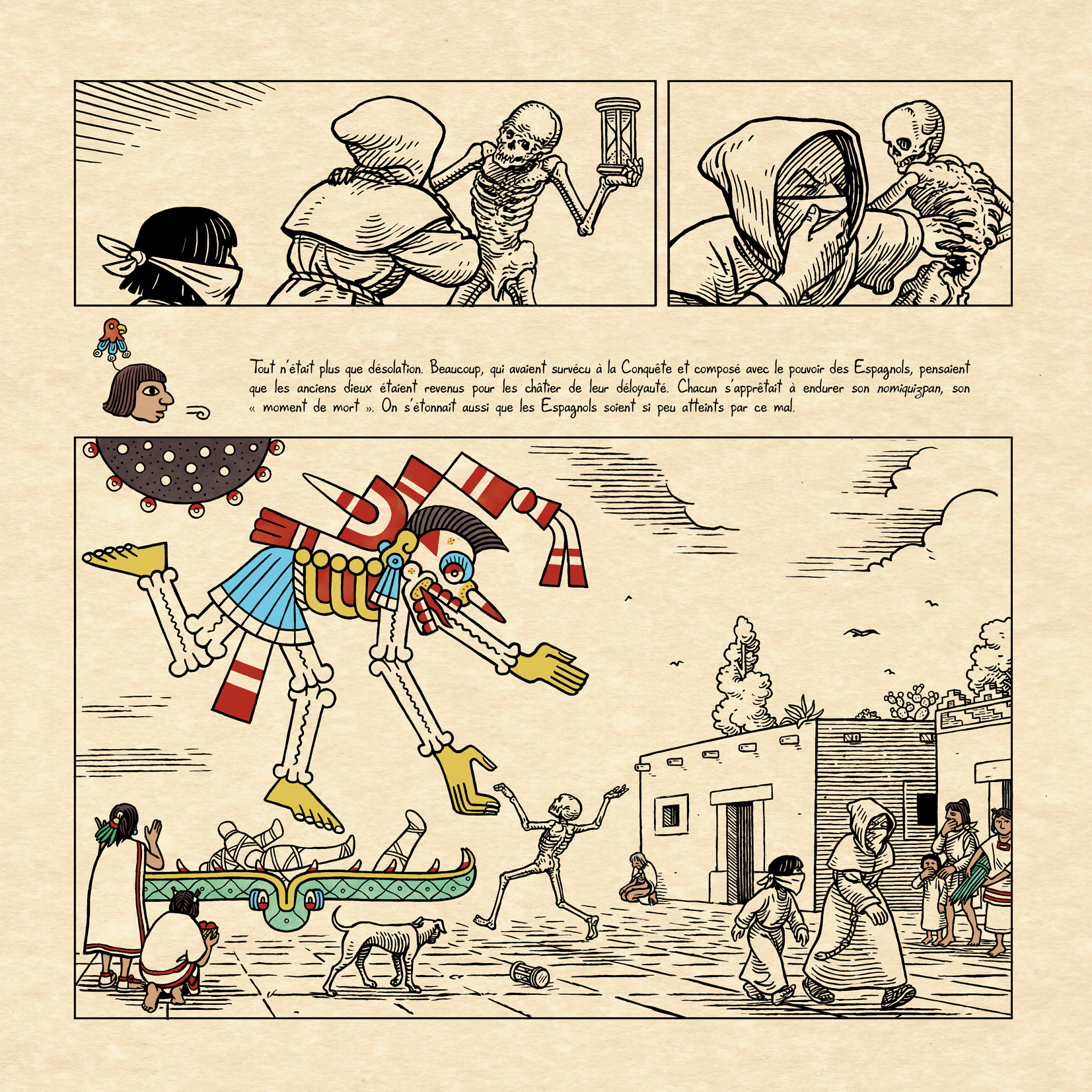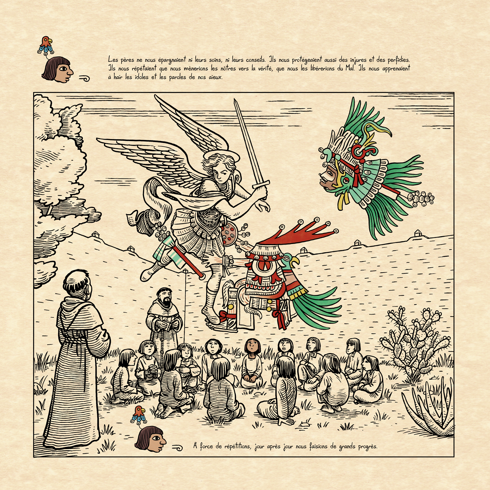 Deux cultures graphiques singulières et étrangères l’une à l’autre ont été convoquées pour incarner les tensions entre ces deux mondes et les faire se déployer dans le langage de la bande dessinée : les codex nahuas (ou aztèques) et les gravures européennes du XVIe siècle. Le choix de ces références nous a permis non seulement de donner la parole aux deux mondes, mais surtout de les faire se frotter l’un avec l’autre de multiples manières : par le choc, le recouvrement, le surgissement, la coexistence, jusqu’aux métamorphoses, contaminations, entremêlements, mélanges… C’est un conflit d’images et d’imaginaires, un conflit qui se joue au fil des pages, dans les formes mêmes de la représentation.