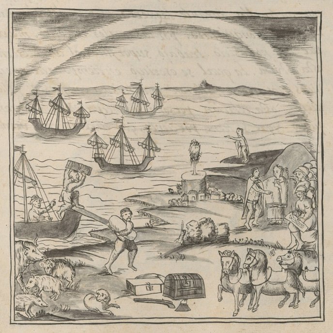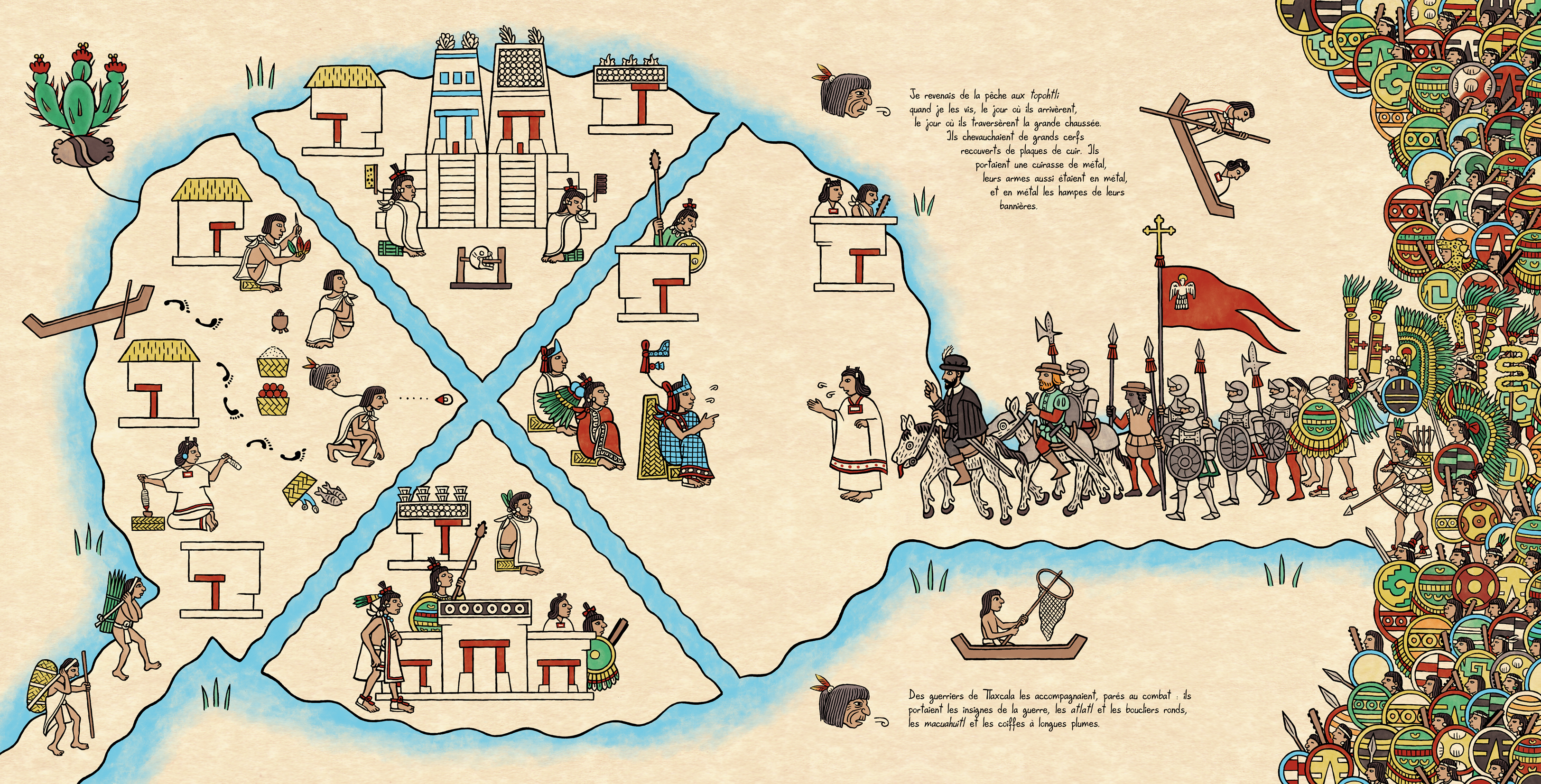 La double-page qui ouvre cette séquence commence par l’arrivée des Espagnols à Tenochtitlan.