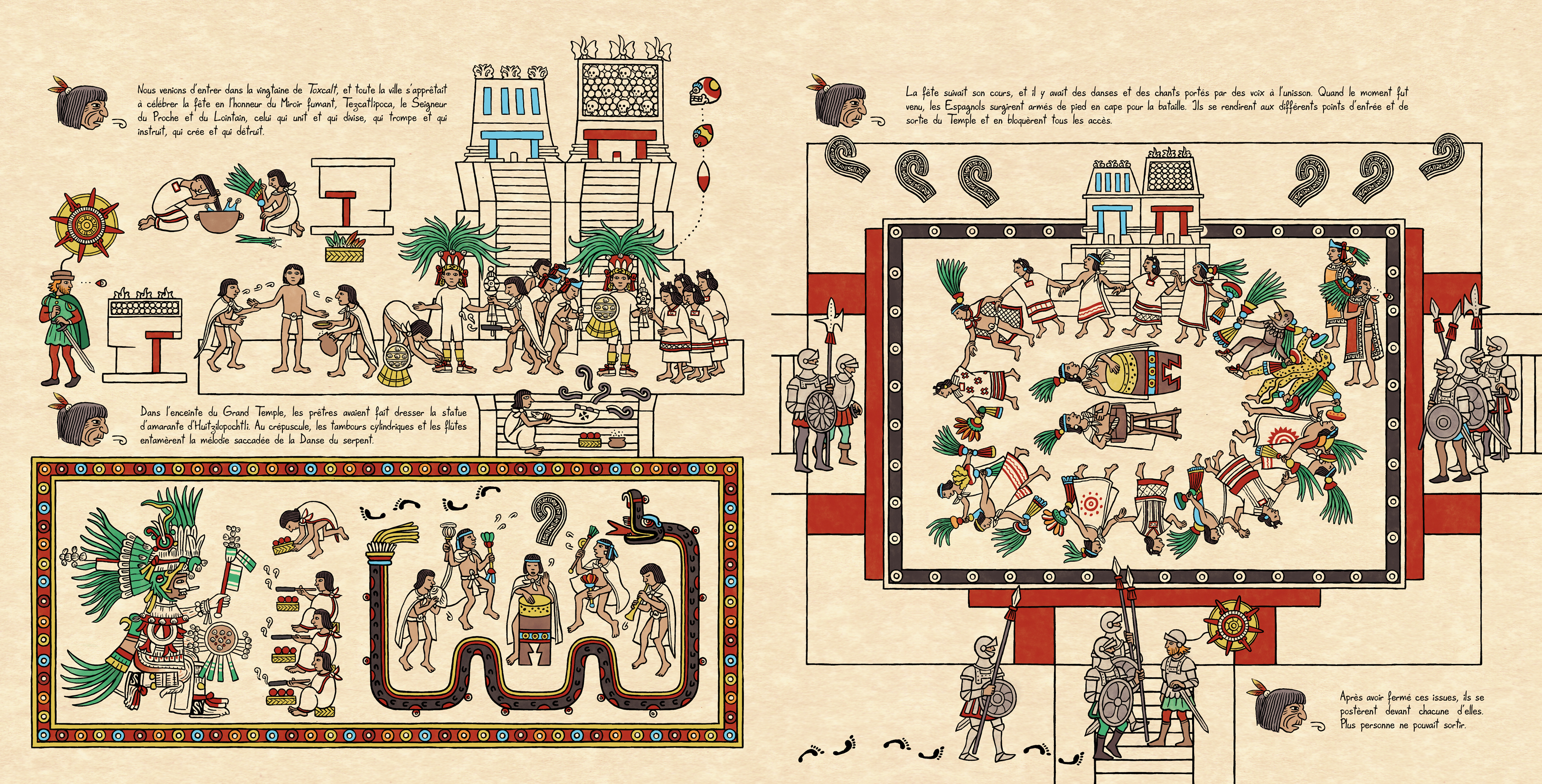 En 1520, date à laquelle se situe ce moment du récit, la fête de Toxcatl est menacée par les Espagnols qui encerclent le Templo Mayor… Voilà sur quoi se termine cette double page.