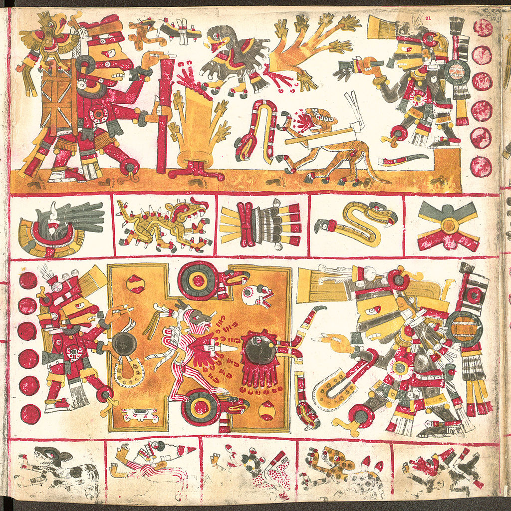 Par ailleurs, je conseille une conférence formidable et accessible sans pré-requis de l’historienne de l’art et des religions Sylvie Peperstraete, « La nuit est ronde et le temps est bleu », qui permet de toucher du doigt quelques aspects du mode de pensée aztèque à partir de l’analyse d’extraits de codex (qui s’en trouvent éclairés) : https://www.youtube.com/watch?v=u4SVfPrJxvI