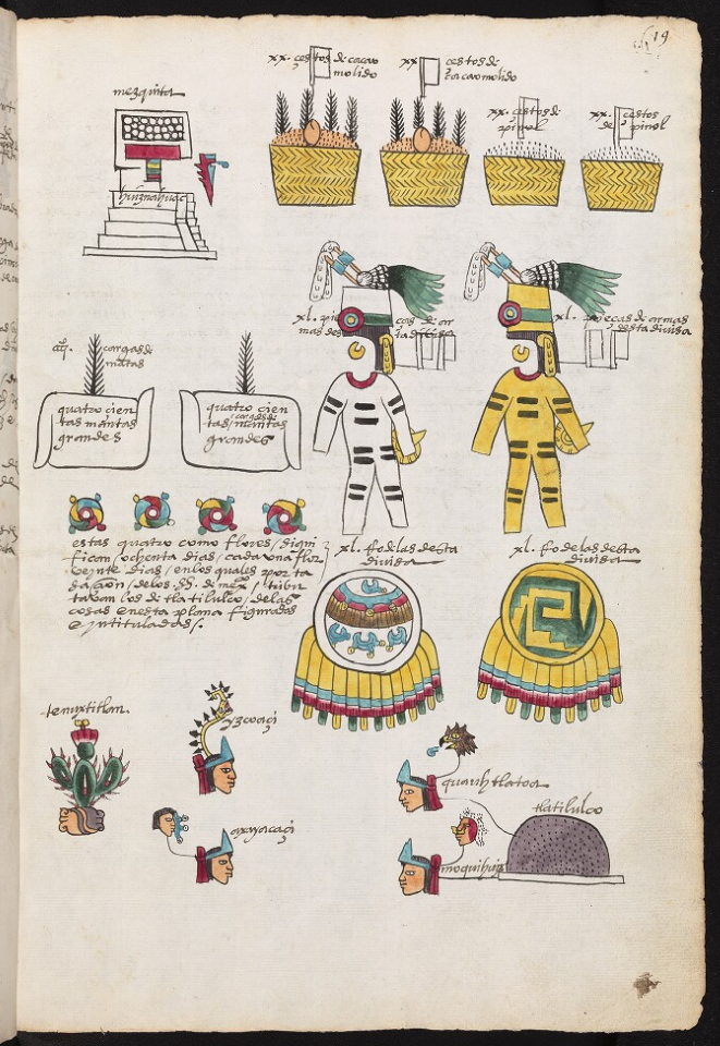 Codex Mendoza (vers 1541-1542) : https://digital.bodleian.ox.ac.uk/objects/2fea788e-2aa2-4f08-b6d9-648c00486220/surfaces/406f4df0-478b-49e8-b68a-06827a9ac0fc/