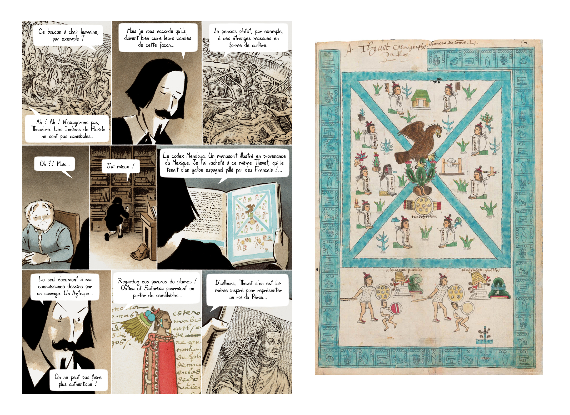 Dans l’une des scènes de Florida, on voit Théodore de Bry découvrir un codex mexicain que possède le cosmographe anglais Richard Hakluyt… et comment il s’en inspire pour certaines représentations des Timucuas de Floride qui figurent dans l’ouvrage des Grands Voyages consacré à la Floride. Ce manuscrit mexicain est le Codex Mendoza, du nom du premier vice-roi du Mexique, Antonio de Mendoza, qui apparaît, lui, au début des Sentiers d’Anahuac !