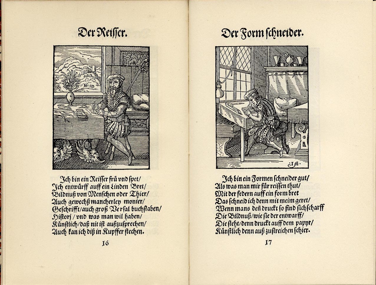 J’ai surtout joué des hachures à la façon des graveurs de cette époque, en me nourrissant particulièrement des gravures sur bois de Hans Holbein et de Jost Amman, notamment issues des planches du Livre des métiers qu’on peut consulter intégralement sur Gallica. Les gravures sur bois ont des traits plus épais que les gravures sur plaques de cuivre, et les compositions y sont plus simplifiées, le souci du détail moindre. C’était donc particulièrement approprié pour être digéré dans le langage de la bande dessinée, car l’exigence de lisibilité et de simplicité y sont fondamentales (du moins pour la forme de bande dessinée que je souhaite pratiquer). De plus, le noir et blanc des gravures permettait des jeux de contraste avec les couleurs vives des codex mexicains.