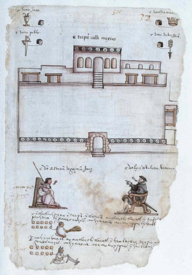 Le narrateur de notre récit, Antonio Valeriano, qui a été désigné par Sahagun dans le Codex de Florence comme « le principal et le plus savant » de ses collaborateurs, a fini par devenir gouverneur du quartier indigène de San Juan Moyotlan, un des quatre quartiers de Mexico. J’ai cité sans presque la modifier une représentation du tecpan (palais) du gouverneur de San Juan Moyotlan dans le Codex Osuna, réalisé en 1565, soit à une date proche de sa nomination à ce poste (1573). Les représentations que l’on trouve dans ce manuscrit sont d’un caractère hybride, quoique beaucoup plus proche des figurations traditionnelles nahuas que dans la plupart des images du Codex de Florence. Les maisons, par exemple, ne sont pas en perspective ni hachurées mais ne sont pas travaillées en aplat non plus : elles sont pourvues de dégradés de couleur qui indiquent une volumétrie des formes qui n’existait pas dans les anciens codex.