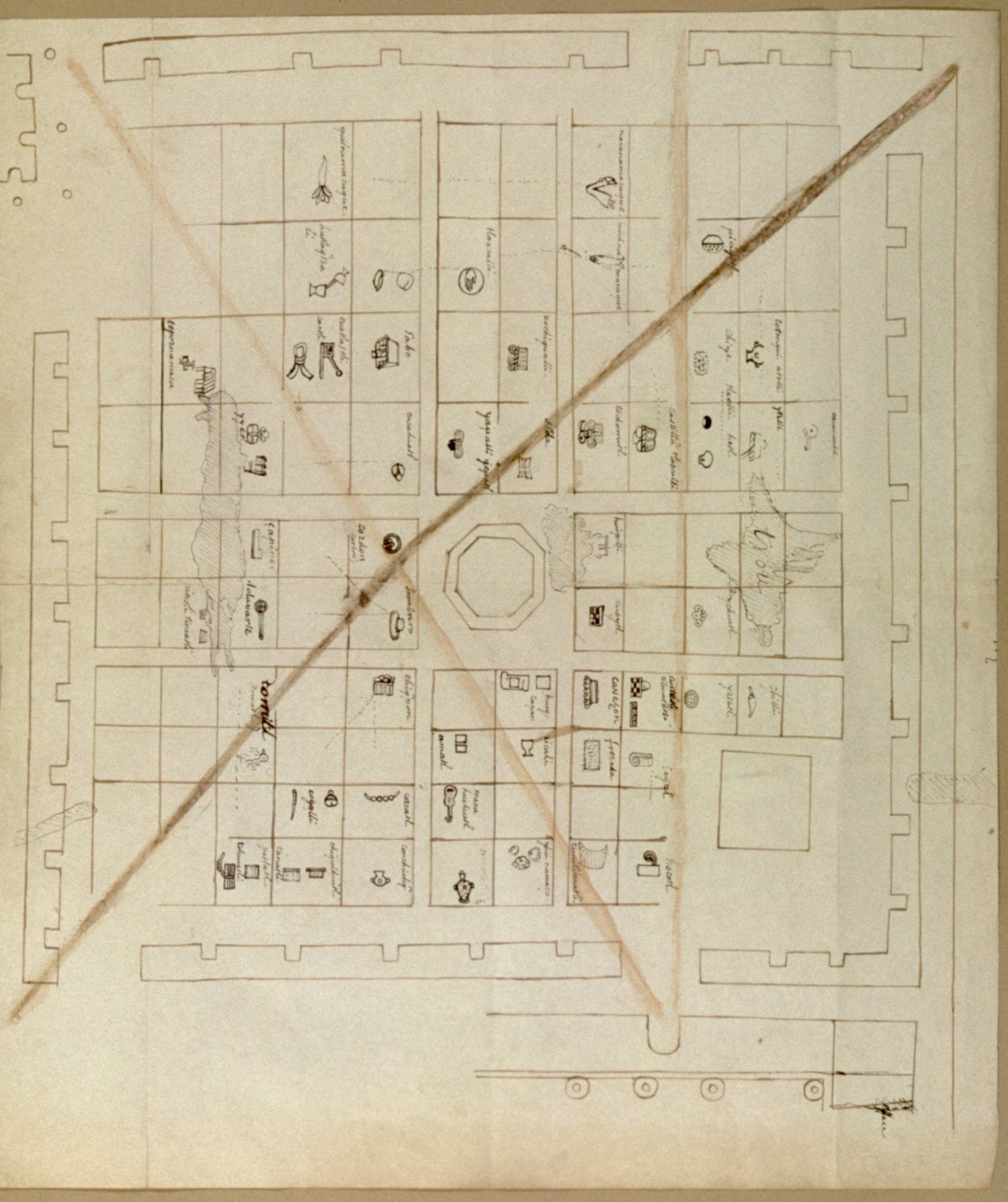 Plan du tianquiztli (marché) de San Juan Moyotlan à Mexico, vers 1580, conservé à la Bibliothèque Nationale de France, Département des Manuscrits, Mexicain 106b.