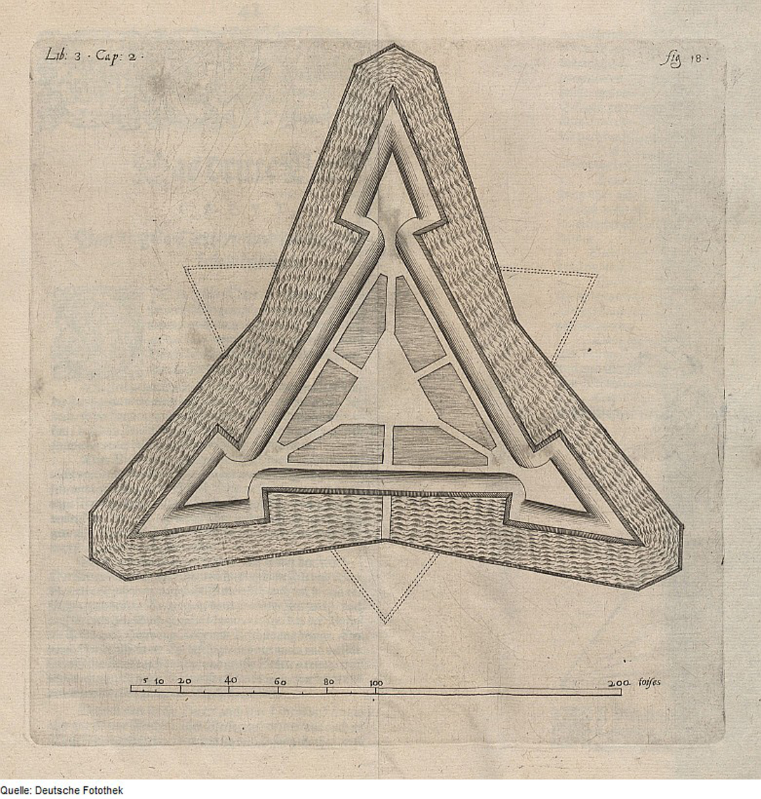 Frédéric Métin m’a montré par ailleurs un plan de fortification en triangle de Errard daté de 1600, qui peut donner une idée de ce qu’on pouvait concevoir géométriquement à la fin du XVIe siècle :